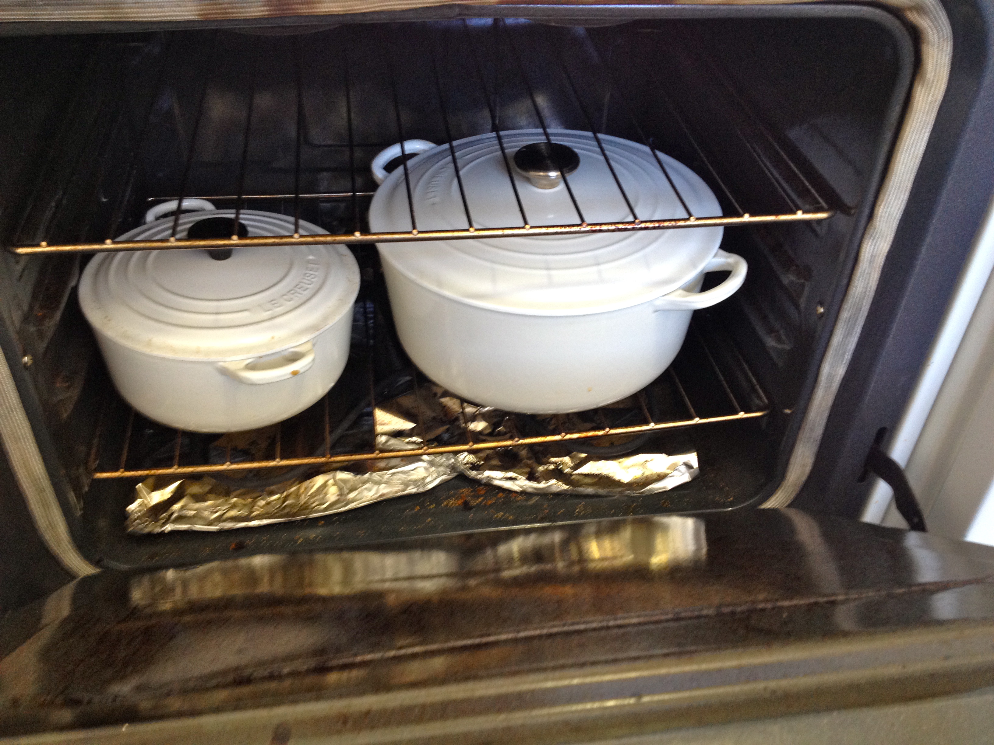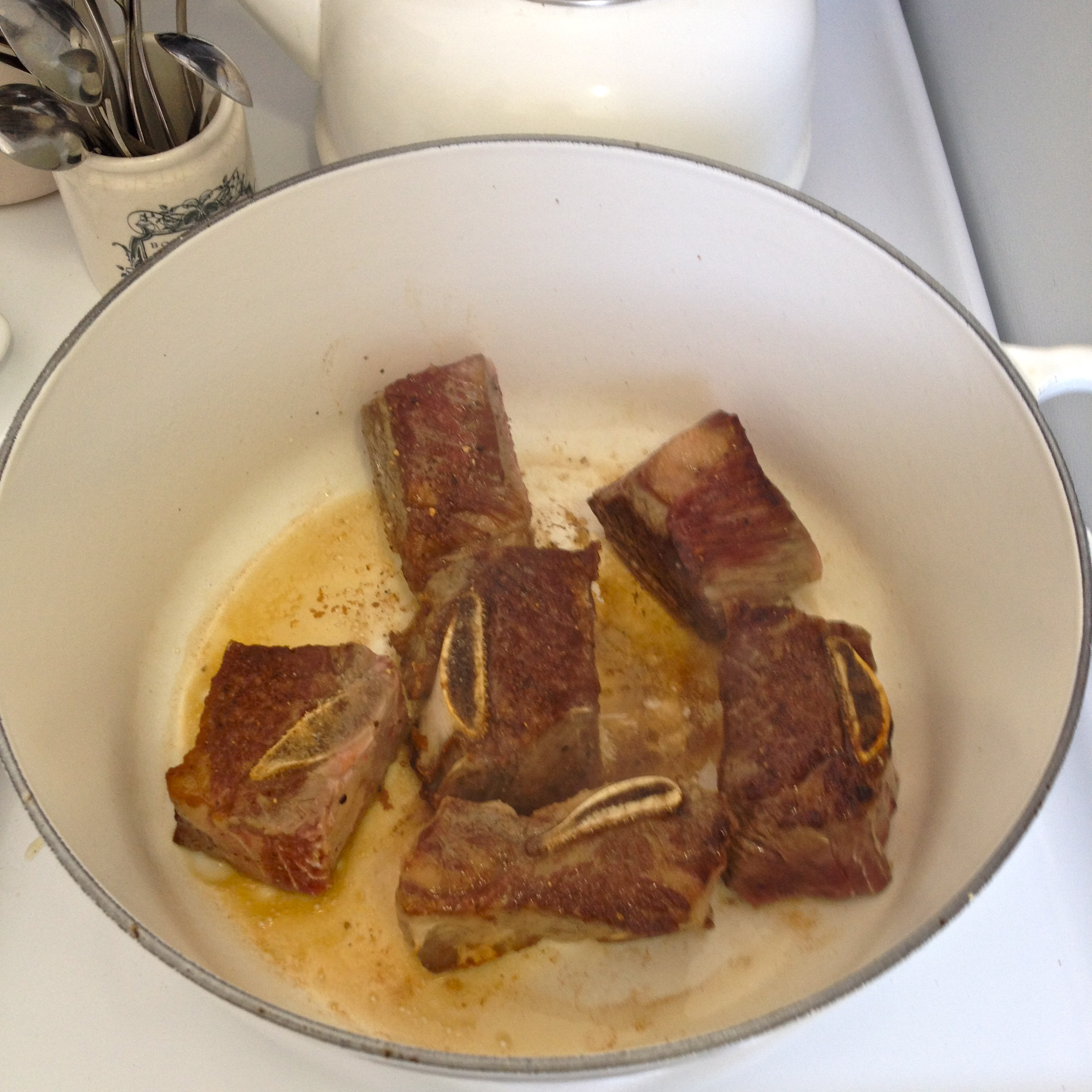 Mommy and Daddy size Le Creusets ready for their 2 hour roasting. I used two as I cooked about 7 lbs of short ribs.