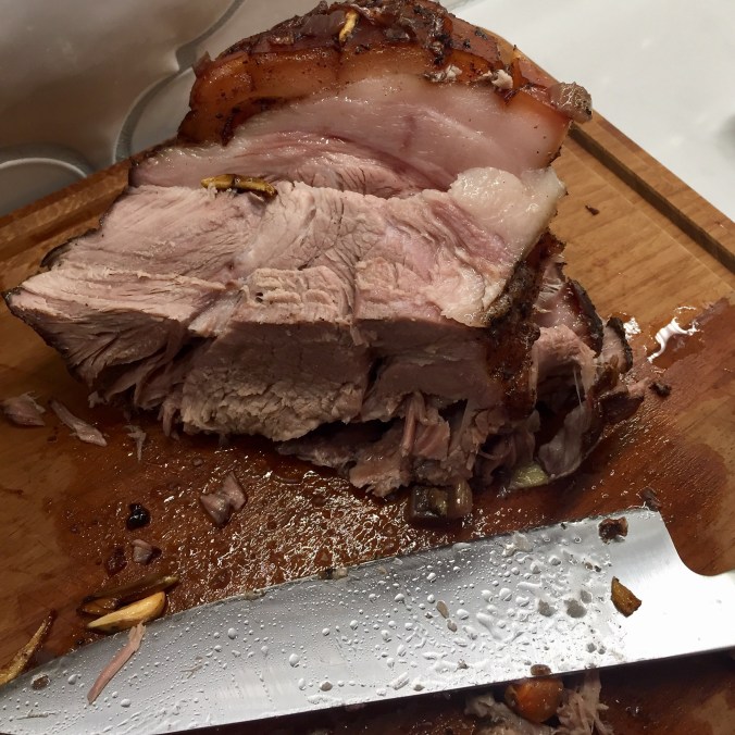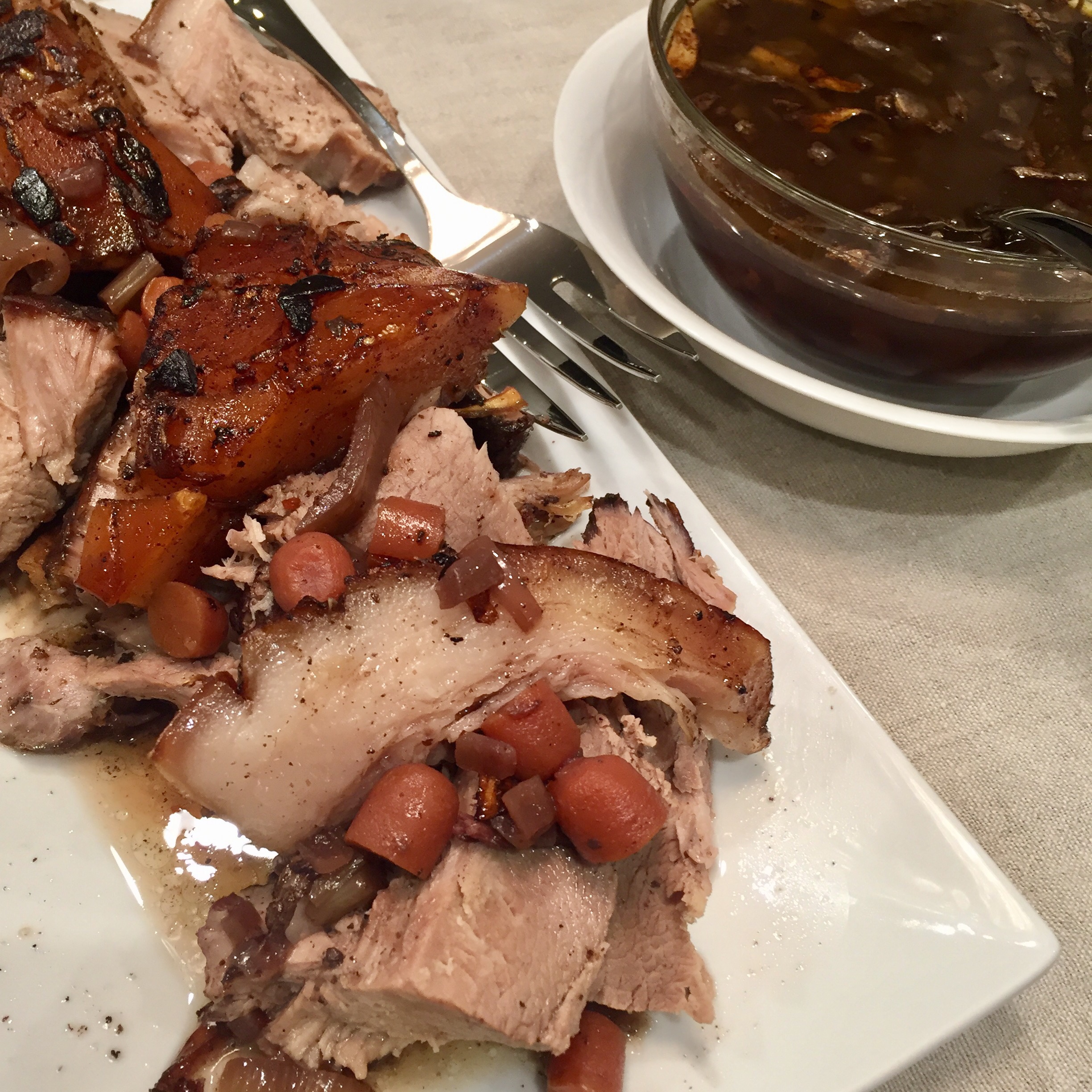 My fiancé has excellent taste. And I’m not talking about style or taste in women (me!). I mean actual, physical taste. In another life, I’m sure he was a Grand Master Sommelier at some foofy restaurant. He can taste exactly what food pairs with a particular wine and what herb a recipe might be missing, so he makes a great partner in the kitchen. When we cook together, I usually write down general direction, Simon ignores everything but the important things, adds his own spices and techniques, and it always comes out flawless. This past Friday we made a roast for two of our lovely friends who live down the street. Since I had to work all day, I wrote down directions, left for work, and eight hours later I came back to Simon’s creation. And it was amazing. So I’m sharing his version of pork shoulder – feel free to change things and add your own personal touches too!