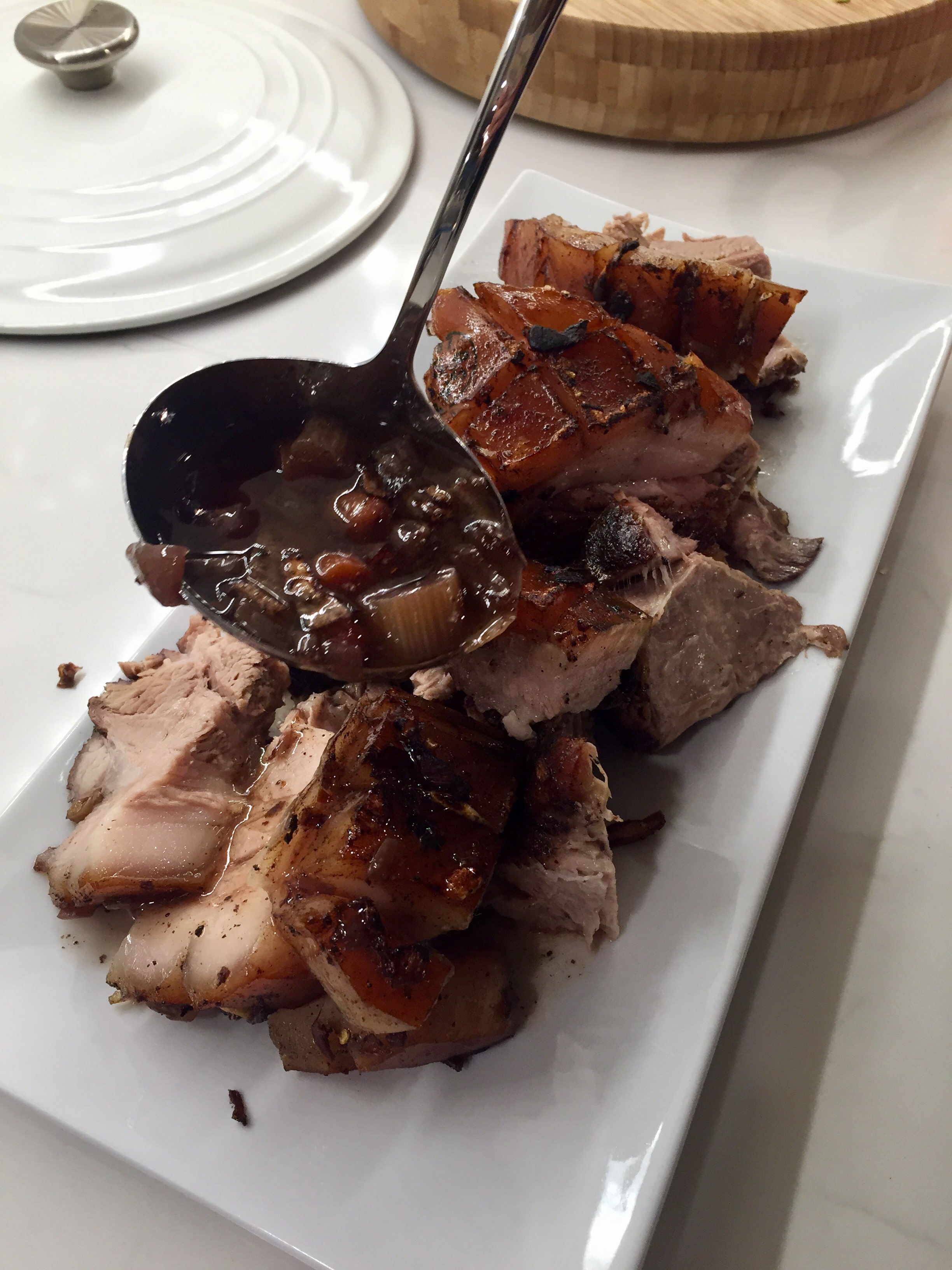 Approximately 15 minutes before serving, remove pork from the dutch oven, set aside and cover wit aluminum foil. Place dutch oven on stovetop on medium-high heat and reduce liquids by about 1/3 to make a delicious sauce. Serve meat with sauce paired perfectly with your favorite red wine. Enjoy!