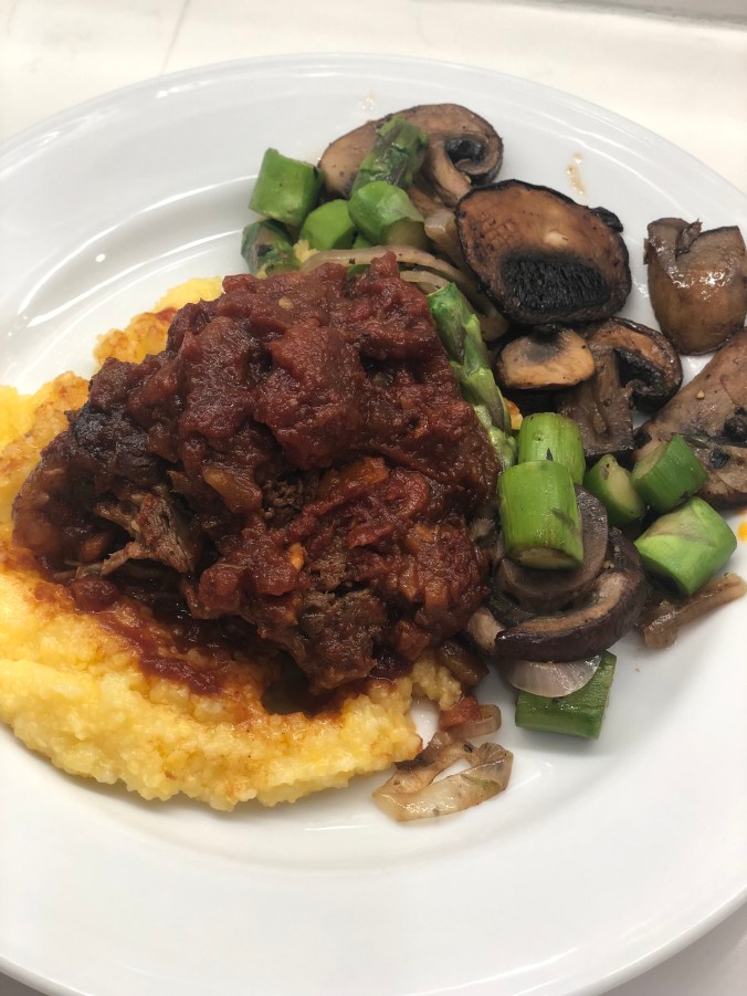 Preheat oven (if cooking in a cast iron pot) to 375 degrees. Following the instructions on the WS braising sauce, in a large cast iron pot (or pan, if pressure cooking), add 2tbs of canola or vegetable oil on medium high. When oil is shimmering, sear all sides of the osso buco until browned and a little crispy. In the cast iron or pressure cooker, put meat on bottom, then add in WS braising sauce and 2 cups water. The WS instructions don’t say to add water, but I found that the sauce was too cooked-down and a little dry by the end without added water. If using a pressure cooker, cook six hours. If cooking in a cast iron, cook for 2-3 hours, reducing to 200 degrees for the last 30 minutes. Bam. Osso buco done.
