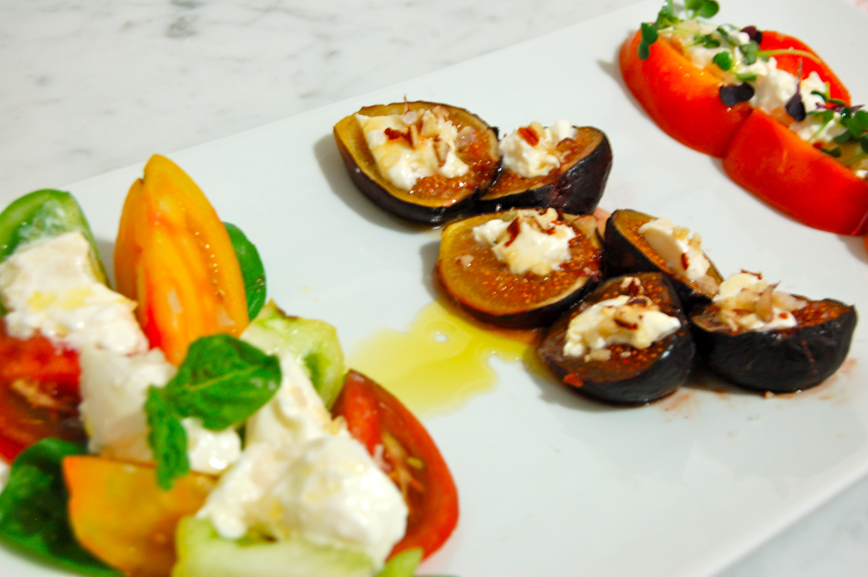 Trio of Burrata Salads: Traditional Tomato, Sweet Fig, and Pickled Peaches