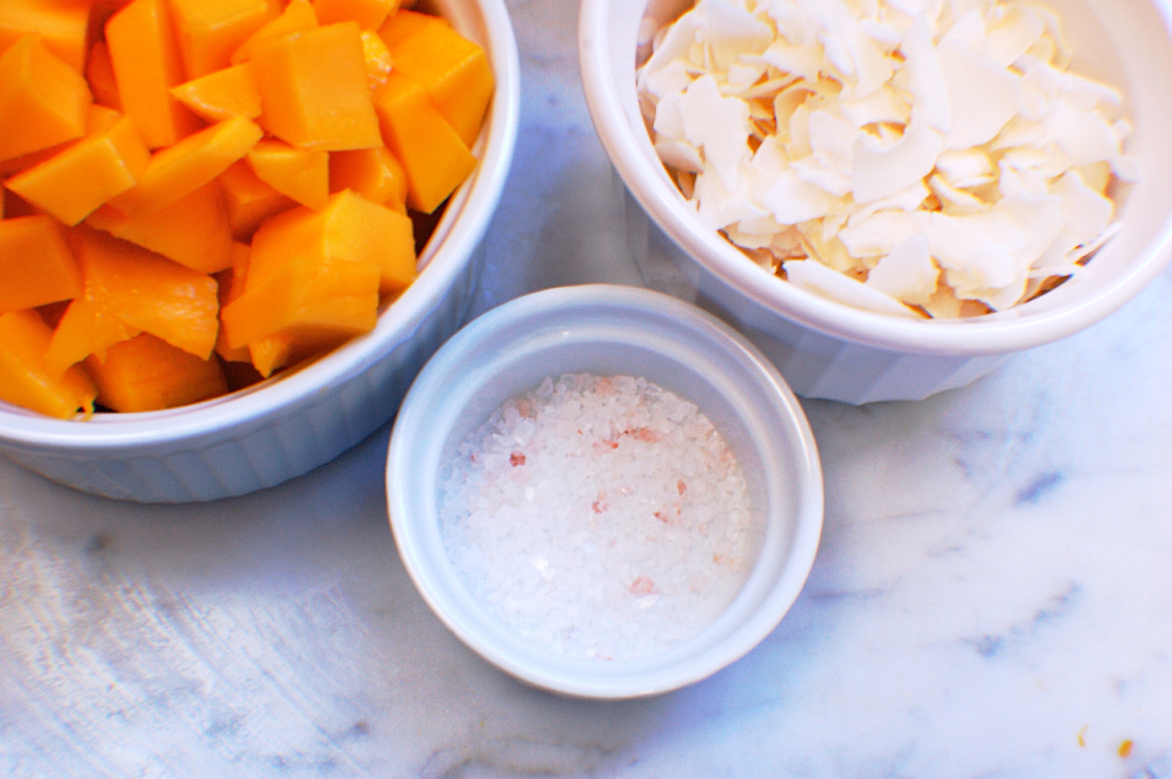 Peel the mangoes, chop and puree until corse. Add all ingredients except for the raw coconut flakes into a saucepan over medium-low heat. Let simmer for about 5-10 minutes until all flavors meld. At this point, you can adjust salt and sugar to taste. Cool the ingredients in the refrigerator (overnight) or in the freezer (about 1 hour). If the ingredients aren’t cool, they will NOT set in your ice cream maker.