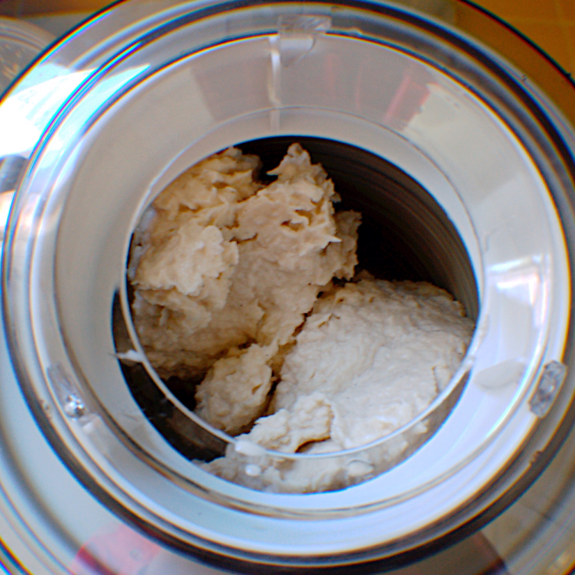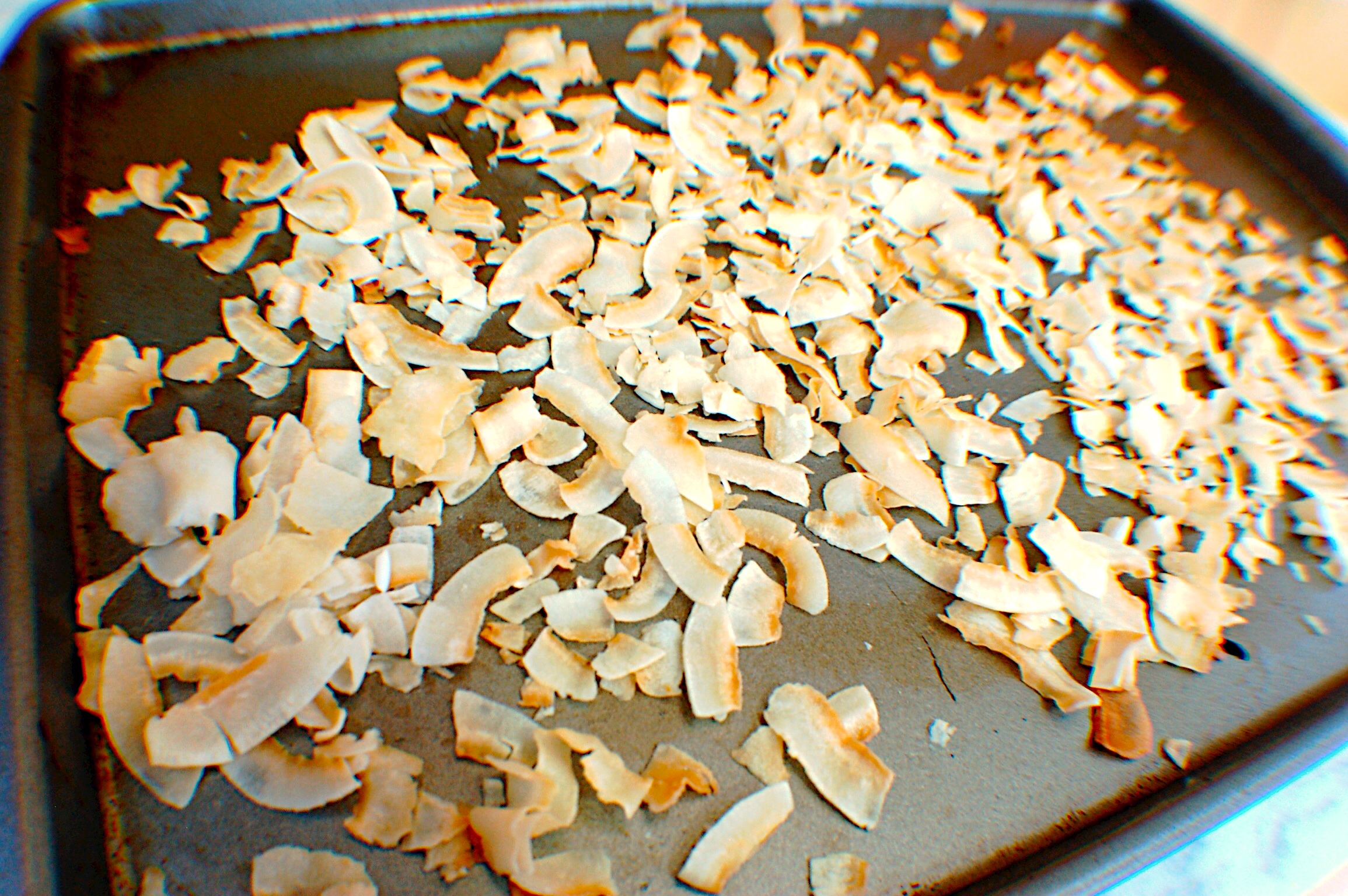 While ice cream base is cooling, toast raw coconut flakes in a 350 degree oven for 5-10 minutes until slightly brown. WATCH the coconut carefully. It goes from brown to black in an instant. I know this because I did this. First batch thrown out, second batch watched much more closely!